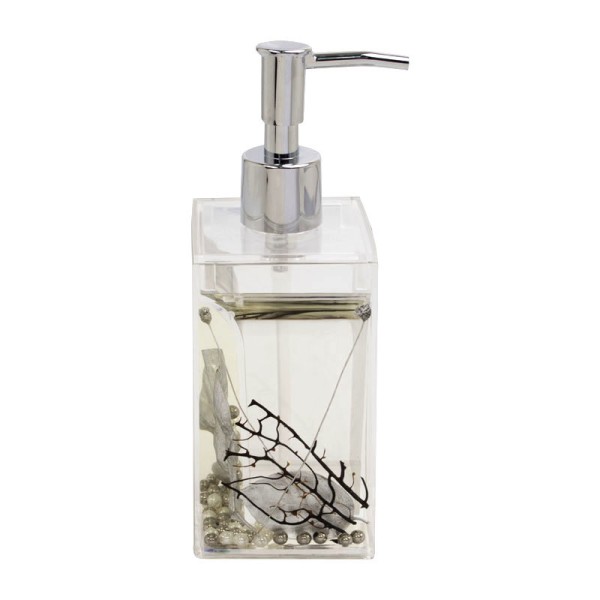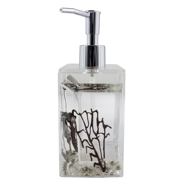 • В серии представлены: дозатор, мыльница, стакан, стакан для зубных щеток, ёрш; • Материал АБС - пластик, натуральные окрашенные растения и бусинки, которые свободно плавают в специальном масле; Упаковка белый картон;¶• В ТТ располагать лучше на стелла