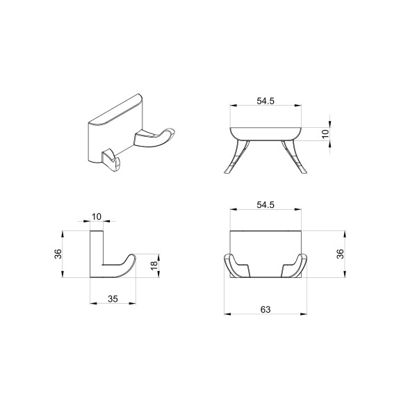 • Тип - подвесной; • Крепление к стене - дюбели; • Крючок - сталь в цвете полированный хром; • Крючок - двойной.