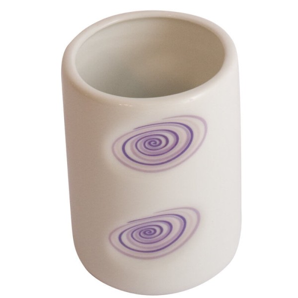 Виготовлений з високоякісної кераміки в класичному білому кольорі, цей стакан прикрашений витонченим малюнком спіралей ніжного бузкового відтінку, що нагадує морський вихор. Його форма ідеально пасує для розміщення щіток, забезпечуючи практичне та гігієнічне зберігання.