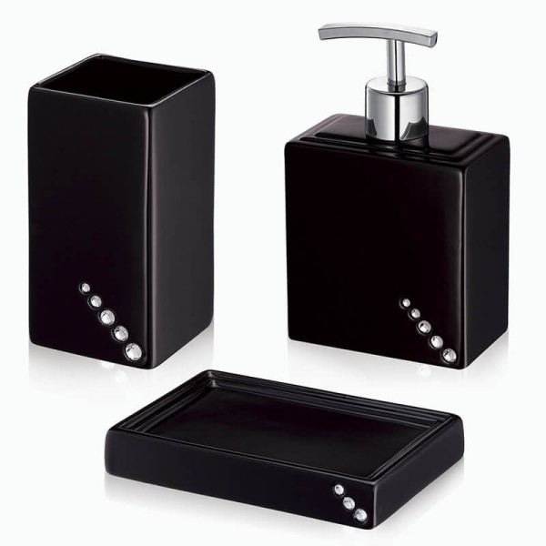 Внесіть нотку сучасної елегантності у свій простір з аксесуаром Trento Tesoro Nero. Цей стакан для щіток, виконаний з якісної кераміки насиченого чорного кольору, ідеально доповнить інтер'єр. Його строгі, квадратні лінії створюють відчуття порядку та лаконічності. Особливим акцентом є невелике оздоблення блискучими каменями, що додає виробу вишуканого вигляду. Використовуйте його як самостійний елемент або збирайте цілісний комплект серії Tesoro Nero, щоб досягти довершеності у деталях.