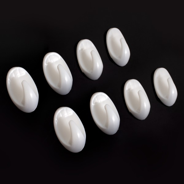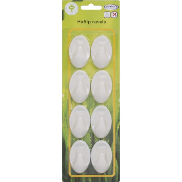 Тип-підвісний; Матерал – пластик; Спосіб кріплення – двосторонній скотч; Колір білий; 8 гачків в упаковці.