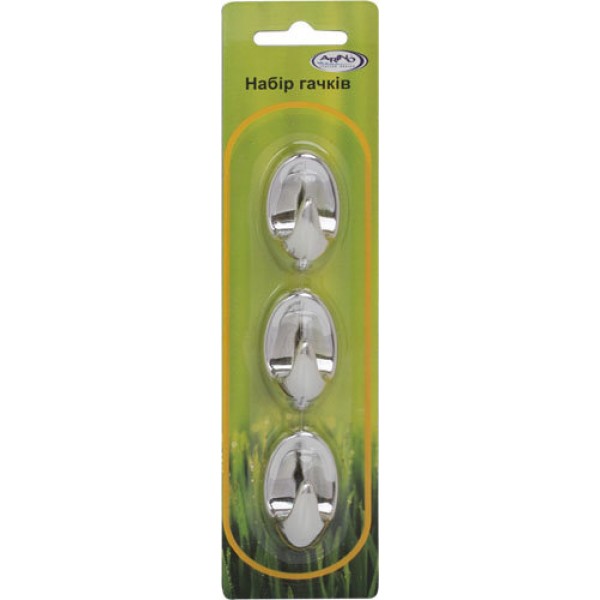 Тип-підвісний; Матерал – пластик; Спосіб кріплення – двосторонній скотч; Колір – хром; 3 гачки в упаковці