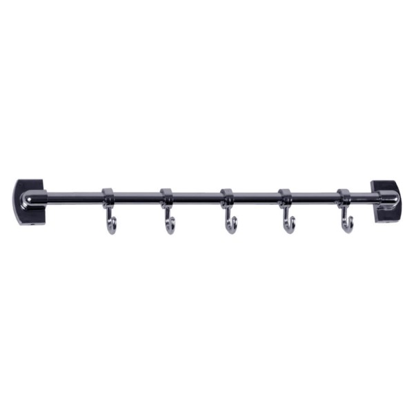 • Тип - подвесной; • Крепление к стене - дюбели; • Держатель и планка - сталь в цвете полированный хром; • Крючки - серебристый пластик, 5 шт; • Крючки двигаются на планке.