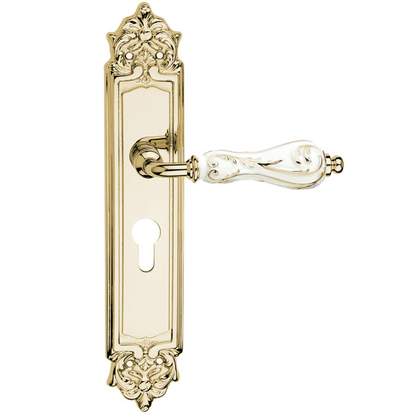 Модель ручки виготовлена в класичному стилі, ідеально доповнює класичний дизайн інтер'єру. Представлена в трендовому кольорі полірована латунь, ручка ручки має фарфорову вставку білого кольору.