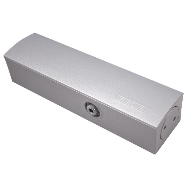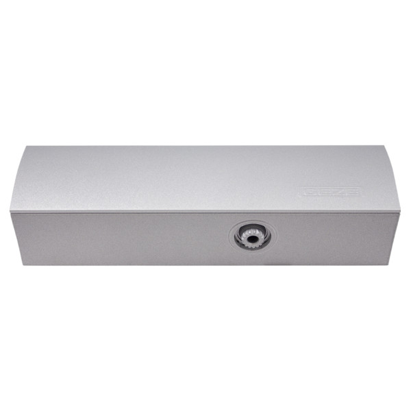 Доводчик Geze TS 2000 у срібному кольорі без тяги. Обладнання підходить для лівосторонніх та правосторонніх дверей завширшки не більше 1250 мм. Вибіркова сила закриття EN 2/4/5 за допомогою зміщеного монтажу. Максимальний кут відкриття 180 градусів.