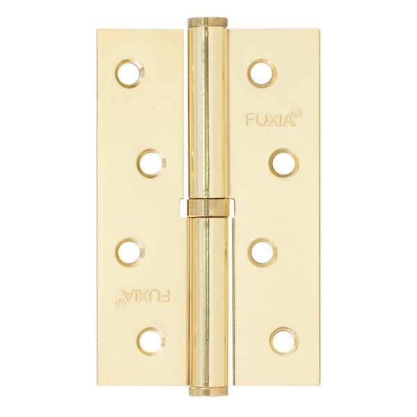 Петля дверна Fuxia 100*2,5*2,5(1 подш, сталь) полірована латунь (права) - це сучасна дверна фурнітура для дому. Дверна петля 100*2,5*2,5 для міжкімнатних дерев'яних дверей виготовлена з високоміцного металу в полировано-латунному кольорі. Для підвищення надійності і довговічності дверної петлі в конструкції використовуються сталеві елементи. Мінімальний контакт регулювальних поверхонь забезпечить надійність і плавність руху петлі. Тип - петля карткова. Відкривання - праве. Розмір петлі - 100 мм. Купивши фурнітуру в магазині Будинок-Маркет Ви завжди зможете бути впевнені в надійності і якості купленого товару!