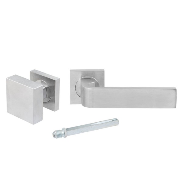 Правостороння ручка на квадратній розеті, має накладний принцип кріплення та представлена в трендовому кольорі матовий хром.