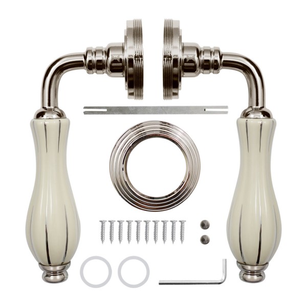 Модель має накладний принцип кріплення, не потребує особливих навичок при встановленні, розету круглої форми та фарфорову вставку на ручці. ручка представлена в класичному дизайні та кольоровому варіанті полірований нікель.