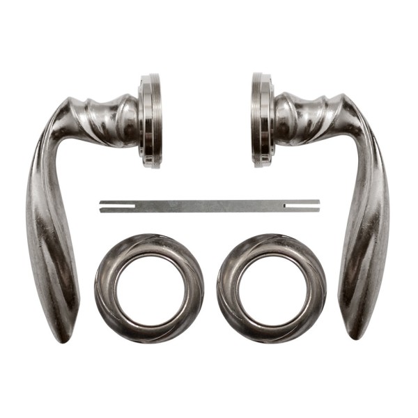 Модель має накладний принцип кріплення, не потребує особливих навичок при встановленні, розету круглої форми. Ручка представлена в класичному дизайні та кольоровому варіанті античне срібло.