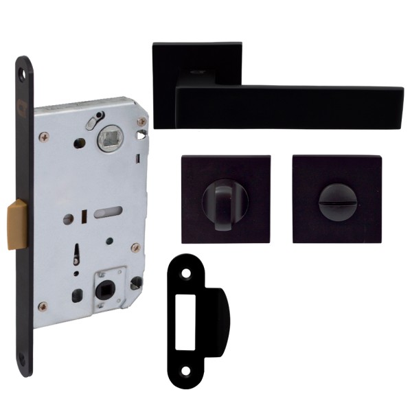 Комплект для міжкімнатних дверей у блістері Comit: Ручка на розеті Kubic А + дверні накладки WC + механізм WC, чорний