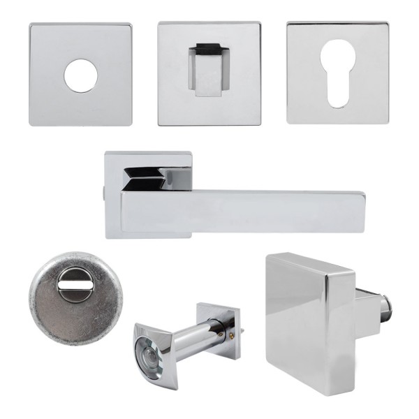 Комплект Quadra для вхідних дверей (ручка, Кноб, накладка під циліндр накладка WC, броненакладка, вічко), хром (50644)