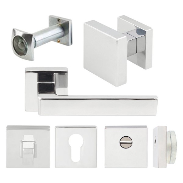Всі елементи комплекту виготовлені з високоякісного матеріалу, стійкого до інтенсивної експлуатації, корозії. Ручка, кноб, накладки та вічко представлені в класичному кольорі хром – поєднавши в собі зручність експлуатації з сучасним стилем. Броньована накладка під циліндр має квадратну форму, забезпечує додатковий захист від зломів або вибивання циліндру.