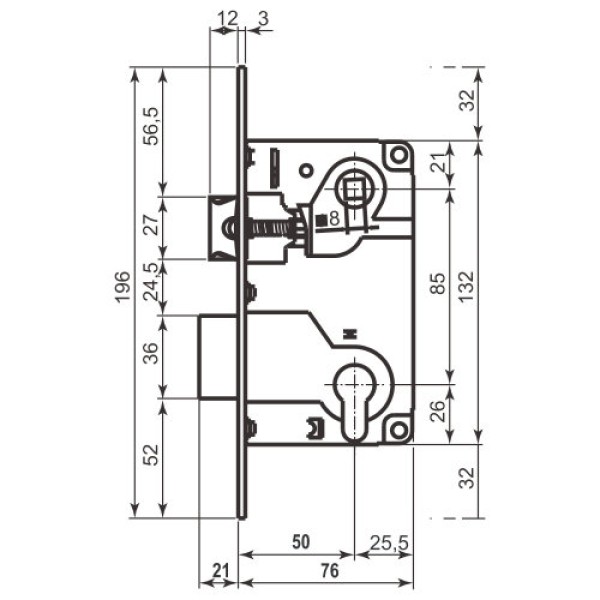 Замок для міжкімнатних дверей з наплавом або без, версії клямки і засувки або тільки клямки. У дверях без наплаву симетричне розташування квадрата ручки та ключової свердловини дозволяє використовувати реверсні дверні панелі. З опуклою клямкою по обидві