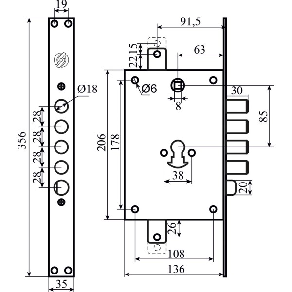 Securemme 2653SCR0328GXX Механізм замка 4-ригеля з засувкою під циліндр мц 85мм, редукторний, (53142)