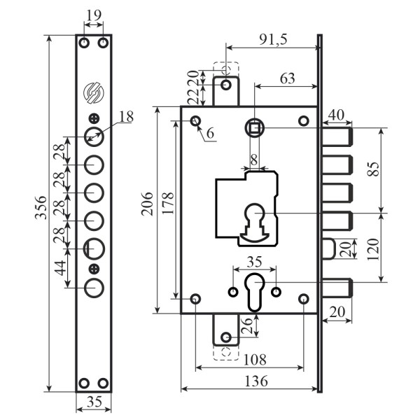 Securemme 2683SCR0328TT2 Механізм замка 5-ригелів з засувкою двоциліндровий мц 85мм, редукторний, (54062)