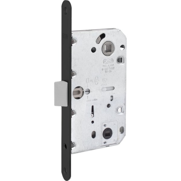 Врізний замок AGB Mediana Evolution з засувкою з поліаміду для внутрішніх дерев'яних дверей. Поліаміди є жорсткими матеріалами з високою міцністю при розриві, а також високою зносостійкістю. Завдяки використаному матеріалу засувки, досягається максимальна безшумність закривання дверей. Механізм засувки AGB B011025093 підходить як для правосторонніх, так і для лівосторонніх міжкімнатних дверей. Перестановка сторони відкривання здійснюється без розтину механізму. При закриванні замку AGB B011025093 сантехнічною клямкою відбувається блокування ходу клямки, а в корпусі замку відбувається розрив взаємозв'язку між ходом руху дверної ручки і механізмом клямки. При цьому фалева ручка залишається в робочому положенні: її можна натиснути, не зламавши при цьому механізм замку. Також можна зафіксувати поворотом замикаючого пристрою засувку всередині корпусу замка. Корпус замок AGB B011025093 запечатаний, для запобігання попаданню деревної стружки та пилу.