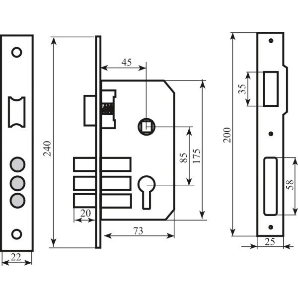 Замок Securemme 2503RCR0328S67 4-ригеля з засувкою під тяги, 5 + 1 ключ, правий