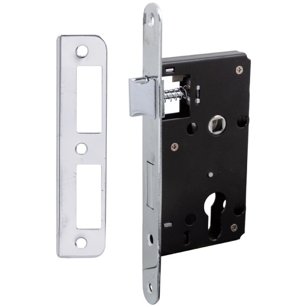 BRUNO 968-45 - циліндровий замок із реверсивним язичком. Підходить для дверей правого та лівого відчинення. ХАРАКТЕРИСТИКИ: Керується серцевиною та ручкою. Язичок виготовлений із сталі з гальванічним покриттям. Язичок реверсивний - замок підходить на праві та ліві двері. Один прямокутний ригель.