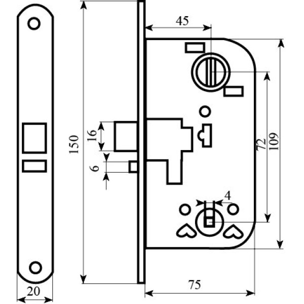 Механізм Comit 2014 для міжкімнатних дерев'яних і сантехнічних дверей. Механізм виготовлений з високоміцного металу. Корпус захищений від попадання пилу або деревної стружки. Монтаж простий і не вимагає спеціальних навичок. Реверсивність засувки дозволяє встановлювати його на двері лівого і правого відкривання. Міжосьова відстань між центром ручки і центром вставки ключа дорівнює 72 мм. Відстань (backset) від зовнішнього краю торцевій пластини до центру ручки одно 45 мм. Комплектується відповідної пластиною. Замок закривається за допомогою стандартного ключа, що входить у комплект, або WC-поворотною ручкою.