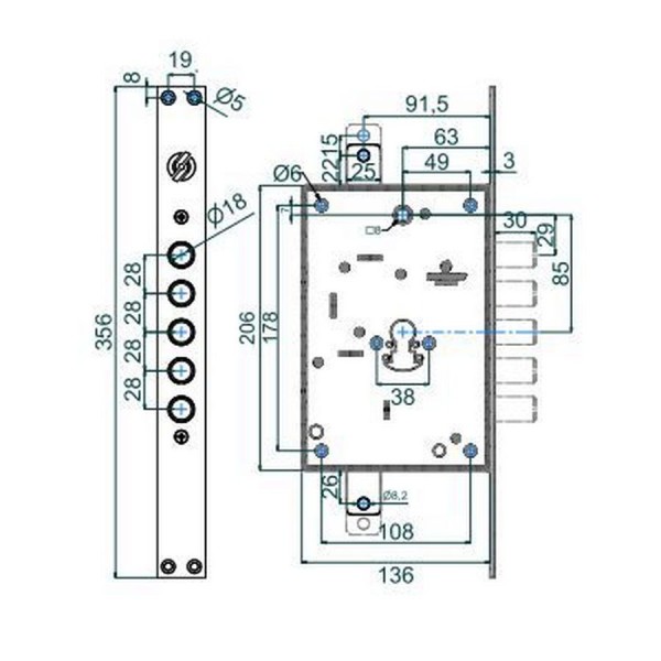 Механізм замка 5-ригелів під циліндр Securemme 2613XCR0328CXX, мц 85мм