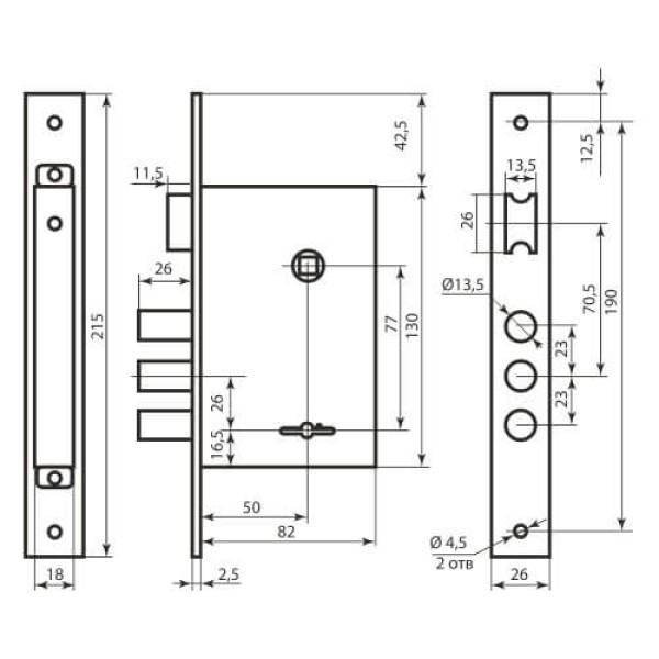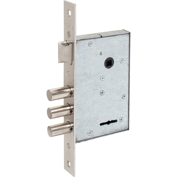 Замок для вхідних дверей Bruno BR-77 - це 3-х врізний ригельний, сувальдний замок посиленої конструкції з реверсивною засувкою. Призначений для установки в металеві двері, шафи і сейфи. Ригелі сталеві циліндричні діаметром 23 мм, виліт 40 мм. Корпус і кришка замку виконані зі сталі. Відстань до ключового отвору (Backset) 50 мм. Замок підходить як для дверей правого, так і лівого відкриття. Переворот засувки виконується без розбирання замку.