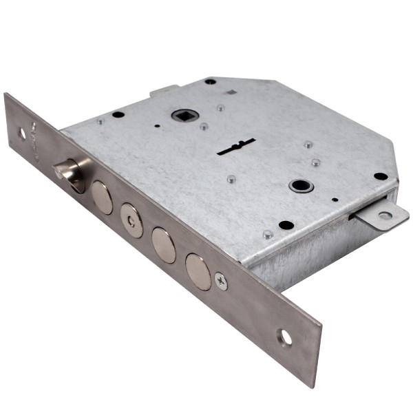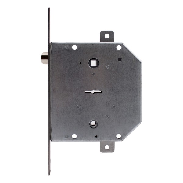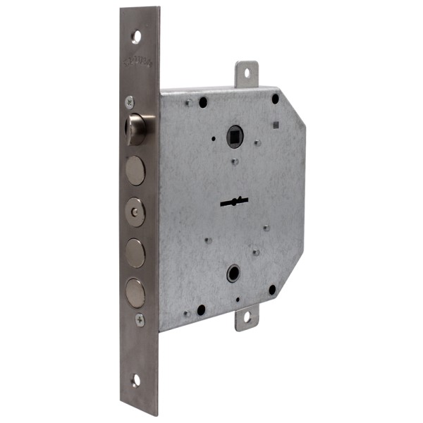 Врізний замок для металевих дверей посиленої конструкції. Три сталеві циліндричні ригелі діаметром 18 мм, виліт 40 мм. 4-х ходовий механізм, клямка діаметром 18,6 мм. Додатковий одноригельний засув - сталевий стрижень діаметром 18 мм.