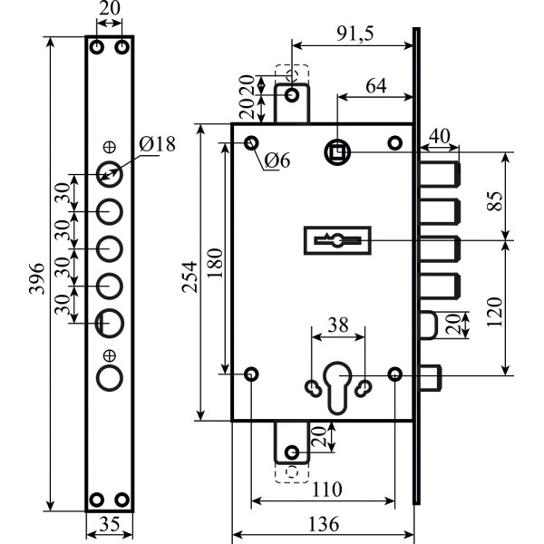 Замок для вхідних дверей Comit CM-21356 - це врізний, двосистемний механізм під євроциліндр. Дана модель комбінованого типу і має два різні типи замикання, поєднані в одному замку. Такі замки представляють надійний захист від розтину та злому: сувальдний механізм забезпечує основне силове замикання, а циліндровий забезпечує контрольну функцію. У замку передбачено залежне замикання обох механізмів: при замиканні циліндрового механізму верхній ключовий отвір перекриває шторка. Основний сувальдний замок закривається на 4 сталеві ригелі за чотири півоберти. Додатковий циліндровий замок закривається на 1 ригель за два оберти. Клямка відмикається як ручкою, так і ключем. Корпус та деталі виготовлені з високоякісної сталі та забезпечують високу надійність замку.