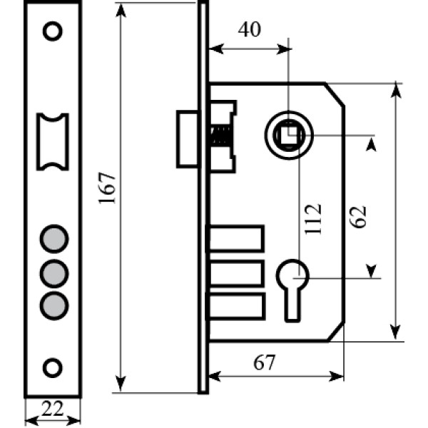 Замок для вхідних дверей Bruno 1025-62 - це 3-х врізний ригельний, циліндровий замок з реверсивною засувкою. Даний замок призначений для установки в металеві або броньовані вхідні двері. Корпус і кришка замку виконані з цинку. Відстань до ключового отвору (Backset) 45 мм. Виліт ригелів 22 мм. Підходить для дверей правого і лівого відкриття.