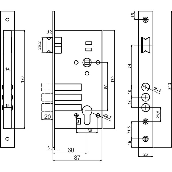 Механізм замка Securemme 2071UCR60XX 3-ригеля c засувкою, під циліндр мц 85мм