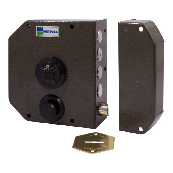 Mottura - італійська компанія, заснована в 1963 році, є світовим лідером у виробництві замків для вхідних дверей, а також циліндрів та інших систем безпеки. Основна причина популярності продукції компанії полягає у високій надійності виробів, які відповідають всім стандартам якості та критеріям безпеки. Накладний замок Mottura 20.510 (20500) однонаправленного замикання із защіпкою. Замикання зсередини поворотною ручкою. Корпус замку виготовлений з оцинкованої фарбованої сталі. Ригелі із нікельованої сталі. Замок комплектується п'ятьма сувальдними ключами. Матеріал ключа - латунь. Довжина ключа - 60 мм. BackSet - 63 мм. Діаметр ригелів - 18 мм. Вихід ригелів - 40 мм. Кількість обертів: 4 півоберта. Розміри корпусу 132х146х30 мм. Клас секретності замка – четвертий. Країна виробництва – Італія. У комплекті 5 сувальдних ключів, накладка на ключовий отвір та відповідна частина.