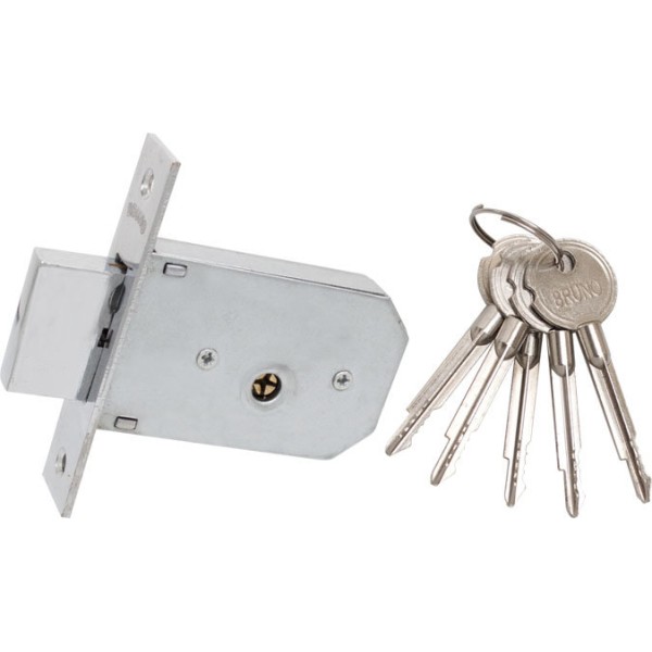 Замок для вхідних дверей Bruno 156F - це врізний 1-ригельний замок (хрестоподібний). Може використовуватись як додатковий замок на вхідні двері або встановлюватись на дерев'яні міжкімнатні двері. Корпус та кришка замку виконані зі сталі.