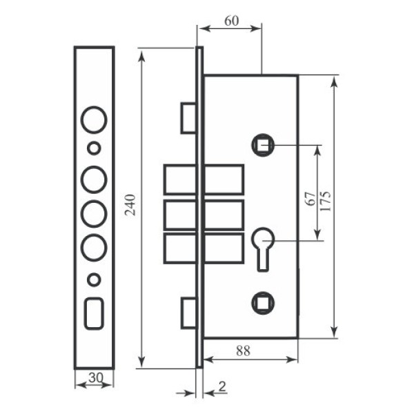 Замок для вхідних дверей Bruno BR-62 - це врізний, циліндровий замок з клямкою і засувкою, без механізму секрету. Призначений для установки в металеві двері, в якості основного замку. Корпус замка - сталь. Виліт ригелів 30 мм. 3 точки замикання. Відстань до ключового отвору (Backset) 60 мм. Колір торцевої планки - хром. Корпус механізму захищений від попадання пилу або деревної стружки. Монтаж простий і не вимагає спеціальних навичок.