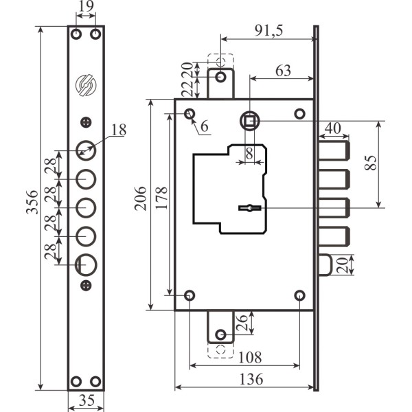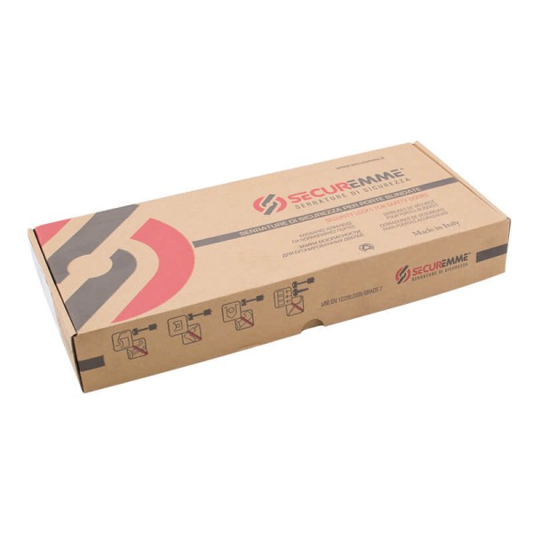 Замок 4-ригельний із засувкою під тяги Securemme 2503RCR0328S67 призначений для встановлення на вхідні металеві двері. Розрахований для встановлення на правосторонні двері. Закриття сувальдного механізму на 4 півоберта забезпечує основне силове замикання замкана 4 ригеля і клямку, а також приводить у дію вертикальний привід на тяги, які дають дві додаткові точки замикання.