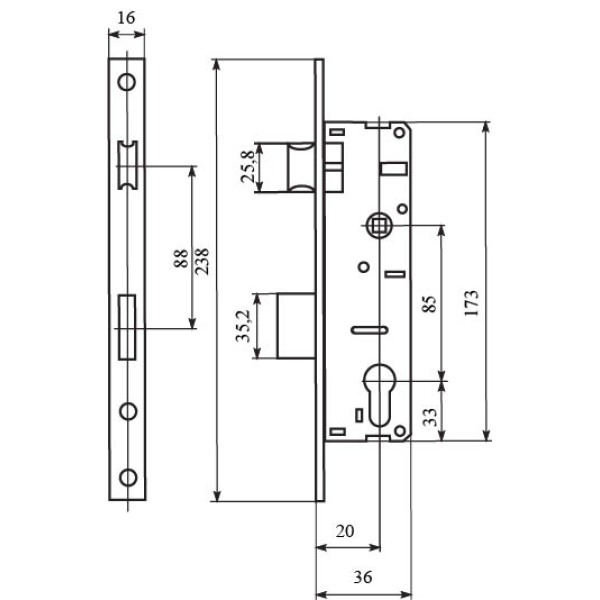 Корпус врізного замка призначений для використання як запірний пристрій у вузькопрофільних дверях з алюмінієвих профілів та ПХВ правого та лівого відкривання.