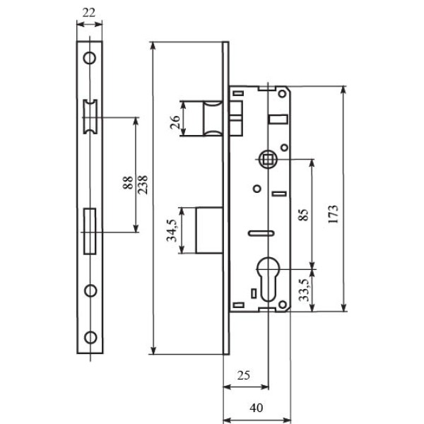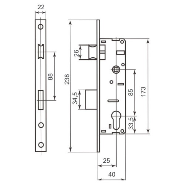Замок для вхідних дверей вузькопрофільний Bruno 153 22-25 (33226)