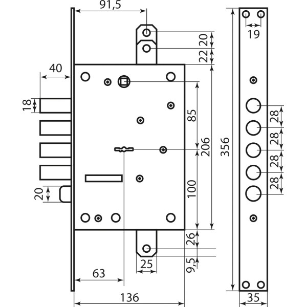 Mottura Замок врізний оснащений засувкою та захистом під тяги та призначений для встановлення на вхідні двері. Засув складається з 5 сталевих ригелів. Корпус та кришка замку виготовлені з високоякісної сталі. Видалення ключового отвору та фальової ручки (Backset) 65 мм, міжцентрова відстань 85 мм. У комплекті йде 5 ключів і накладки.