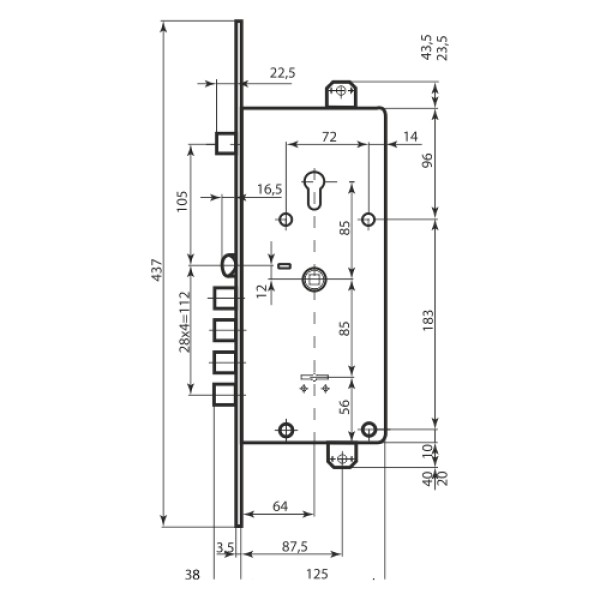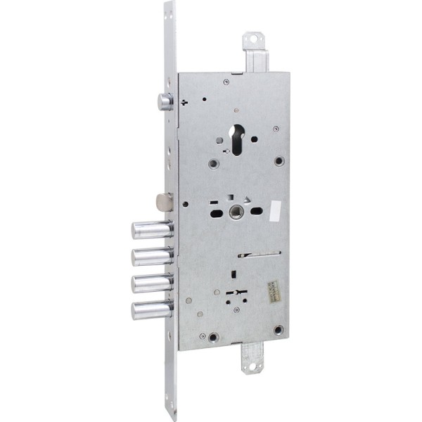 Замок для вхідних дверей Comit CM-21437 - це 4-х ригельний замок з клямкою і допоміжним замком під євроциліндр. Він врізний, двосистемний, полузависимый, з тристороннім замиканням. Корпус і кришка виконані зі сталі. При закриванні на циліндровий замок, свердловина сувальдного перекривається спеціальним важелем - "шторкою", перешкоджаючи маніпуляціям відмичками і ускладнюючи вандальні дії. Основний сувальдний замок: Засув - чотири сталевих ригеля діаметром 18 мм, виліт ригелів - 38 мм, за чотири півоберту. Додатковий циліндровий замок: Один ригель діаметром 18 мм, виліт ригеля 20 мм. за два оберти. Видалення ключового отвору і фалевою ручки (Backset) 85 мм. Засувка відмикається як ручкою, так і ключем.