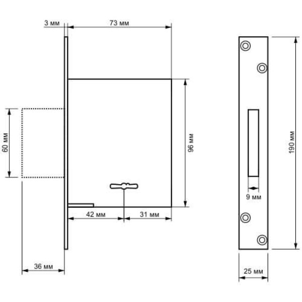 Врізний замок. Видалення ключового отвору: 42 мм.