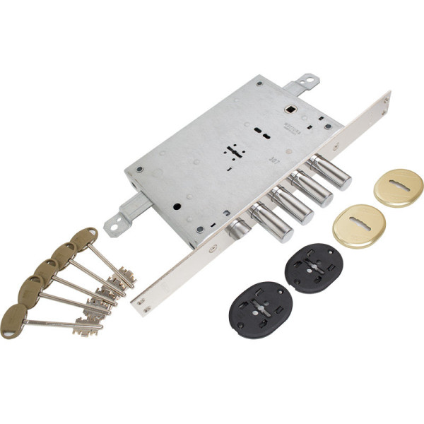 Додаткові параметри: Замок врізний, сувальдний, з клямкою та тристороннім замиканням. Корпус та кришка замку зі сталі. Реверсивна клямка з нікельованої сталі. Засув: чотири сталеві ригелі діам. 18мм. Виліт ригеля - 40мм, за чотири півоберти. Засувка відмикається як від