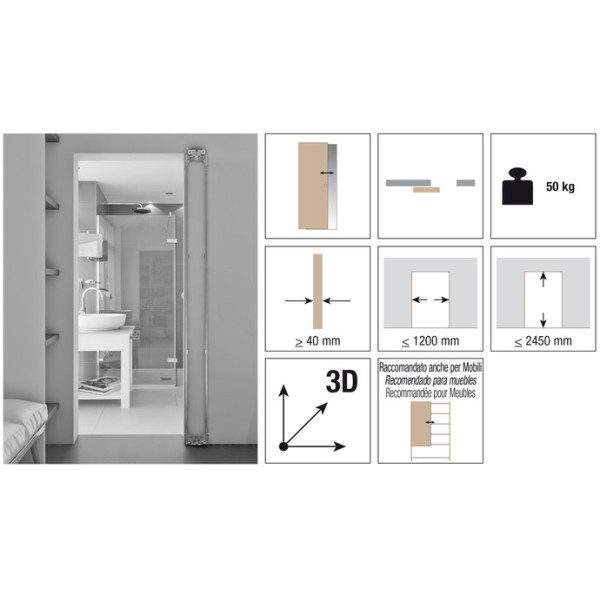Krona Koblenz TRICKS розсувна система прихованого типу, призначена для встановлення на дерев'яні міжкімнатні двері або дерев'яні меблеві двері, максимальною вагою до 50 кг. Дана модель розрахована на висоту дверного полотна 2450 мм та ширину 1200 мм при максимальній товщіні дверного полотна 40 мм. Складається Krona Koblenz TRICKS з верхньої та нижньої направляючих які кріпляться до дверей, а також кріпильної рами з тросовою системою, що монтується до стіни.