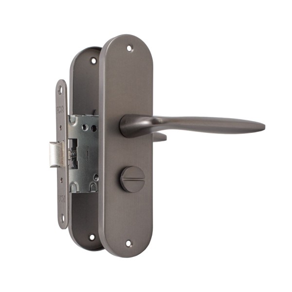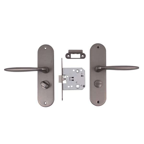 Включає в себе ручку на планці, замок. Призначений він для вхідних дверей. Виготовлений з високоякісної сталі в кольорі полірована латунь/стара бронза.