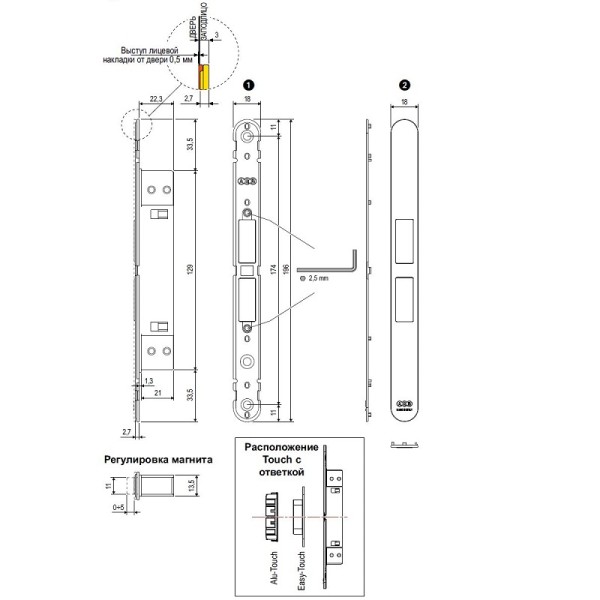 Випуск магнітів відбувається тільки коли стулка вирівнюється з планкою у відповідь. Величину вильоту магнітів можна відрегулювати шестигранним ключем 2,5 мм.