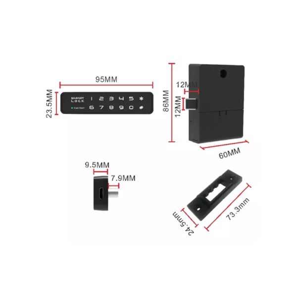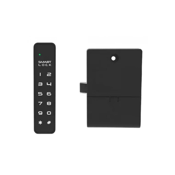 Замок меблевий електронний F023 з чорним алюмінієвим фронтальним корпусом з доступом по сенсорній кодовій клавіатурі.