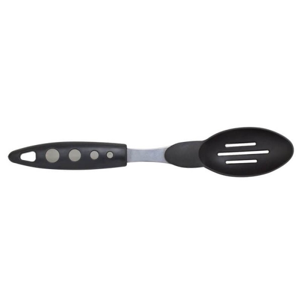 Чорна ложка-шумовка — це втілення практичності для щоденного приготування. Виготовлена з високоякісного пластику, вона стійка до високих температур, ефективно працюючи в гарячих рідинах до +110°C. Міцність аксесуару доповнена основою зі сталі з покриттям. Ложка має ергономічну ручку, що забезпечує легке та зручне використання. Цей лаконічний кухонний інструмент надзвичайно простий у догляді та ідеально впишеться в будь-який сучасний інтер’єр. Надійність та чистота без зайвих зусиль.