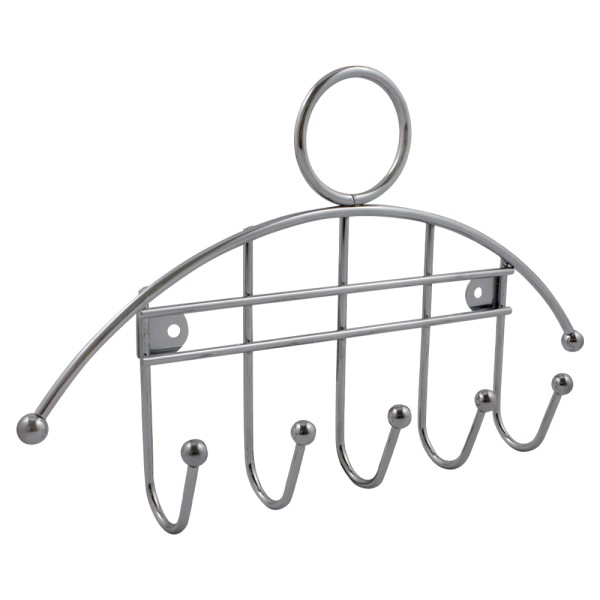 • Тип - подвесной; • Крепление к стене - дюбели; • Вешалка - стальная проволока 6 и 4 мм в цвете полированный хром; • На планке - 5 одинарных крючков.